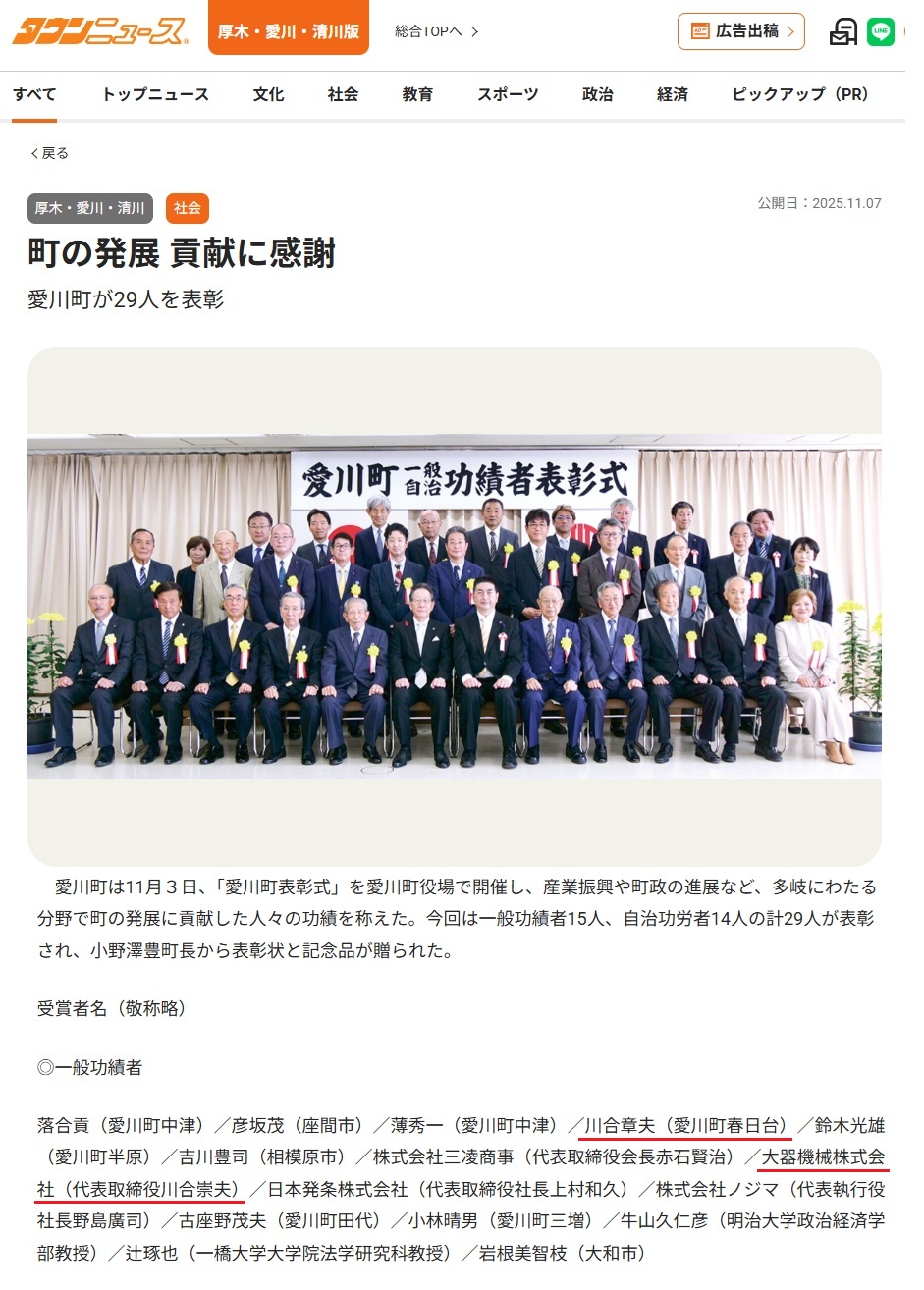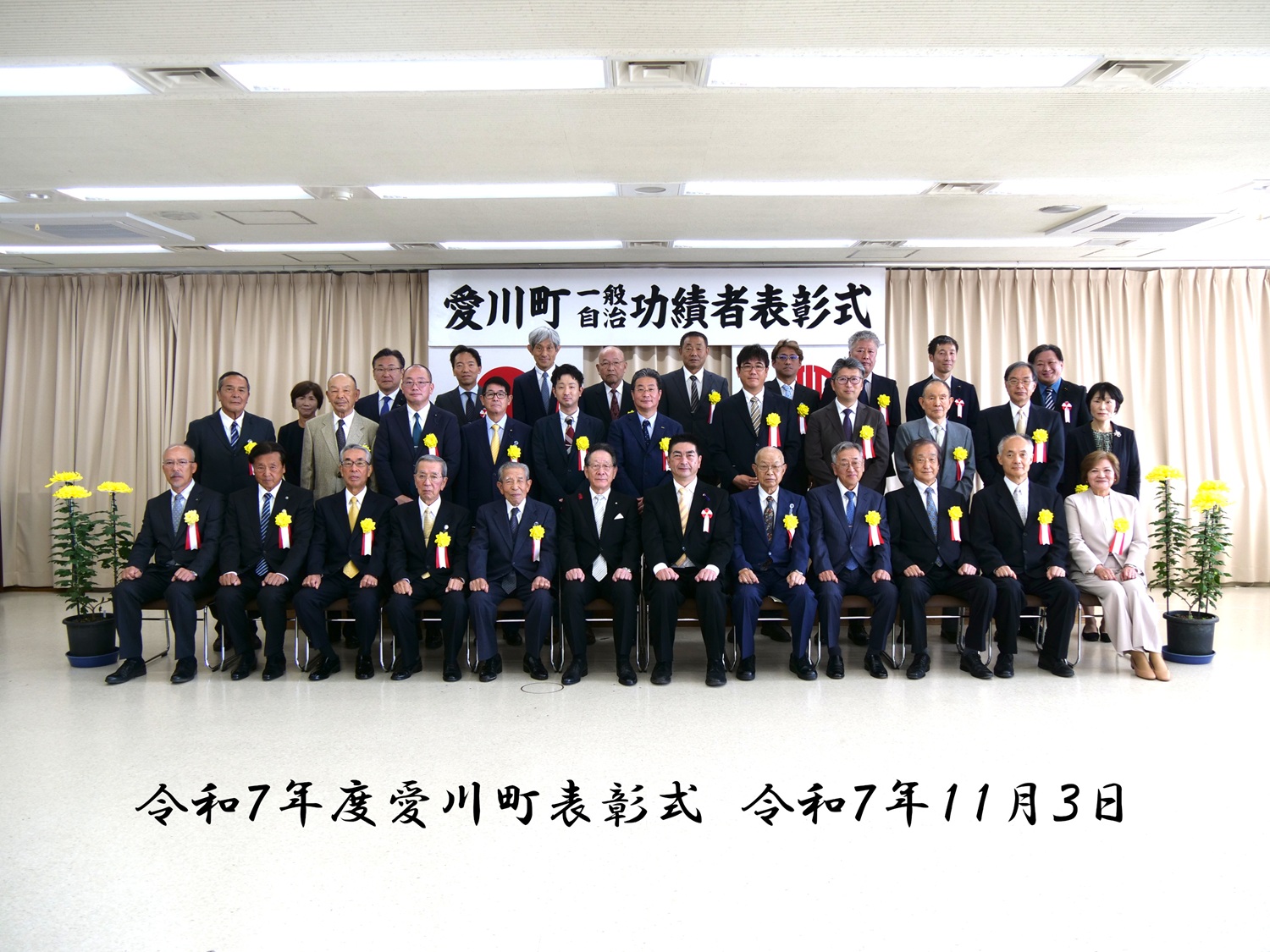 小野澤町長を中心に受賞者全員の記念撮影(前列右から4人目が川合相談役、中列右から4人目が川合社長)